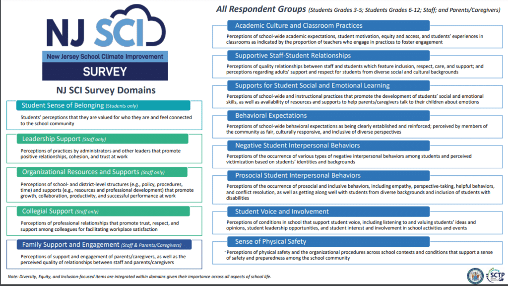 Another option is the NJ School Climate Improvement Survey, which the website advertises as free. I’m assuming that the subjects many parents are upset about with our current survey are on there but those items can be pulled out and made into a separate instrument. Also, if you still think DEI cannot be measured – this survey integrates DEI throughout it’s domains. I guess whoever developed this instrument is also a segregationist.