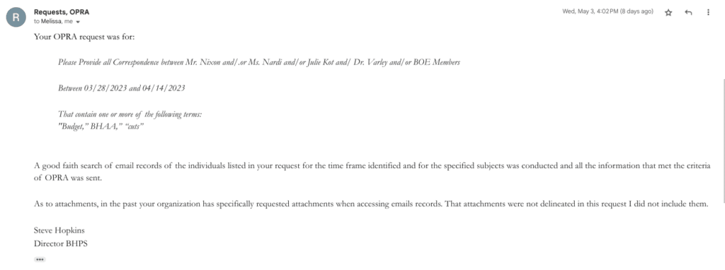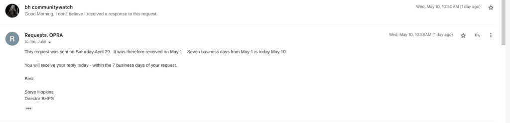 Since the Business Administrator stopped the practice of including the list of correspondence from community members to the BOE during meetings (a practice that spanned years), BHCW has been submitting OPRA requests for this information so that families, students, and teachers could be aware of what residents’ concerns are.