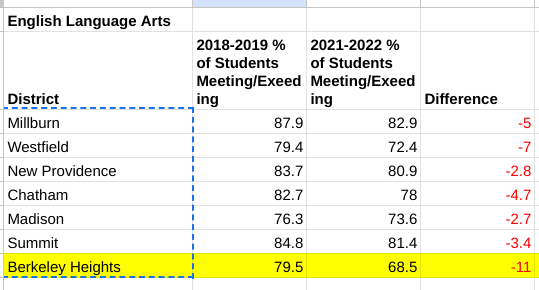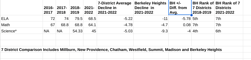 In ELA, the average decline among the seven schools was 5.2 percentage points, Berkeley Heights had a drop of 11 percentage points.