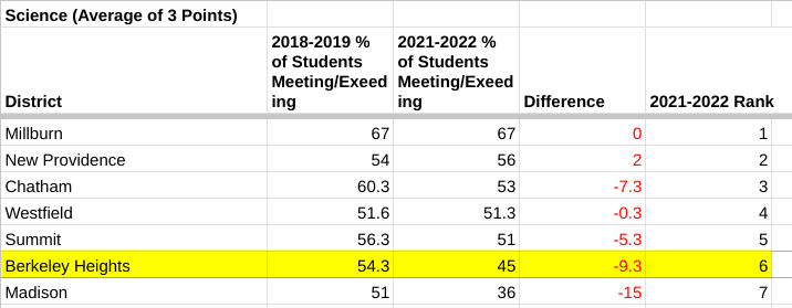 In Science Berkeley Heights was 4 points greater in its decline than the average and went from 4th to 6th in the rankings.