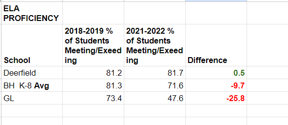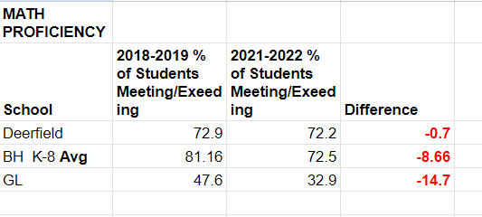 Mountainside did relatively well compared to Berkeley Heights in both Math and ELA. Mountainside families may be interested in the District exploring how impactful the decline in Governor Livingston scores were in connection to Mountainside Students.