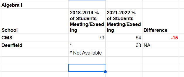 On Algebra I, Mountainside scores were comparable to CMS; however, I could not find 2018/2019 scores for Mountainside.