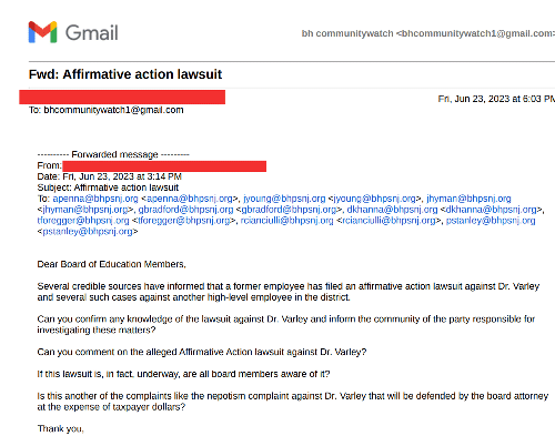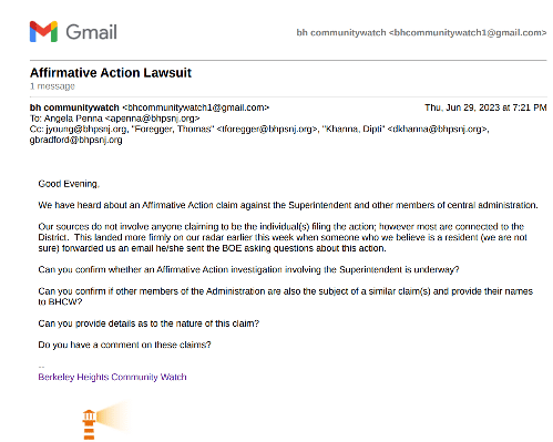 On June 23, 2023, a community member forwarded BHCW an email he/she sent to the Board of Education regarding an alleged Affirmative Investigation involving the Superintendent: