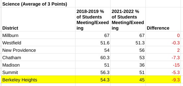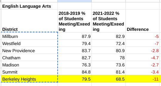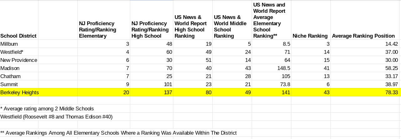 The seven-district dashboard has schools that are geographically and socioeconomically proximate to Berkeley Heights – these were schools selected a year ago. They even include a District suggested by a BOE member (Ms. Stanley). Although we don’t think Westfield was the best choice in the interest of fairness, we included it; it didn’t help our situation look any better.