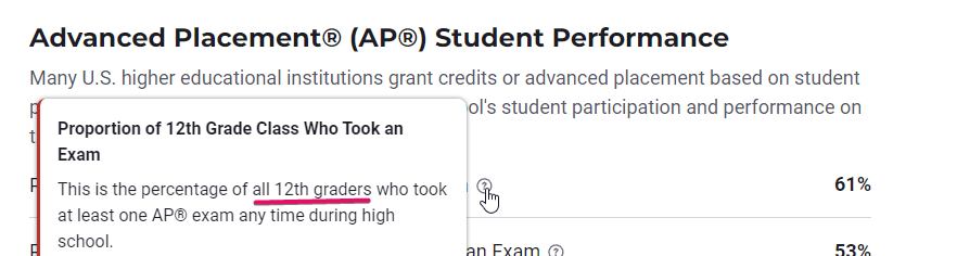 Based on the above screenshot from US News and World Report, 61% of 12th graders sat for an AP exam, and 53% passed it (not 61%/53%of all GLHS Students).