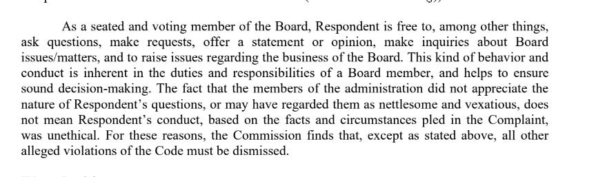 The complaint issued against Robert Cianciulli, Pamela Stanley, Mike D’Aquila, Angela Penna and Jordan Hyman. A decision about this complaint was adopted at the SEC meeting this week . The complaint alleges that multiple sections of the ethics code were violated when these members of the board voted to have the board attorney draft ethics charges against Sai Akiri. Despite Akiri’s reasoned warning, and Tom Foregger’s impassioned pleas to stop and think about what these board members were doing, they insisted on pushing forward. (source)
