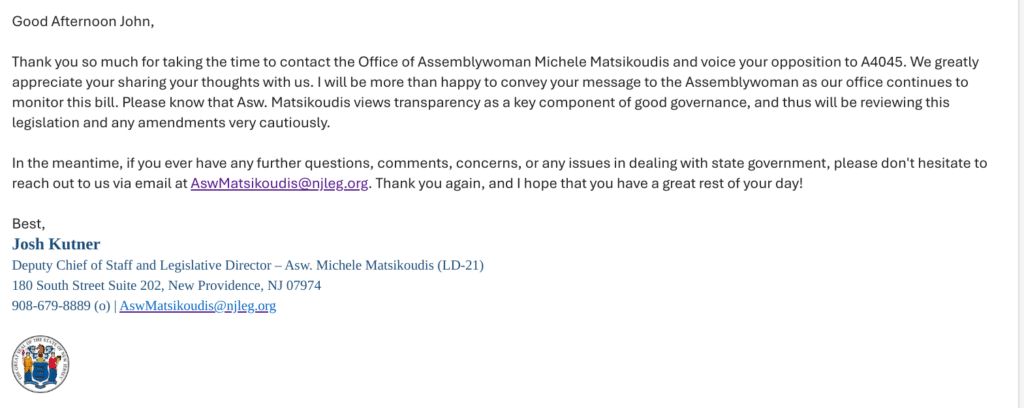 Ms. Matsikoudas was the first representative to respond positively to our concerns during Danielsen’s first attempt to destroy OPRA and is a crucial ally for Berkeley Heights Residents in this battle.