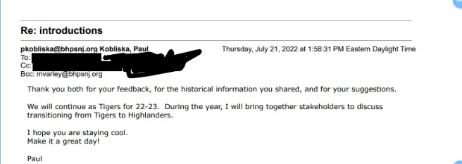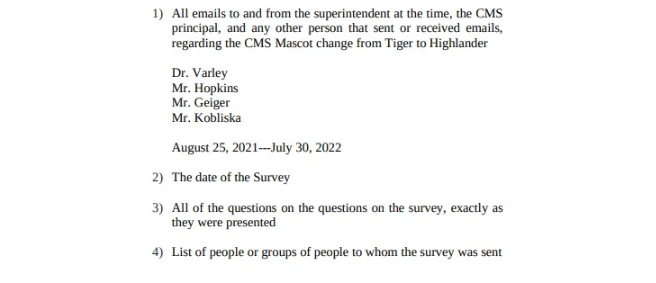 (2) In 2022, Mr. Kobliska contacted the PTO, asking for information only regarding how much Tiger ‘stuff’ they had on hand. In addition to giving that information, the PTO said a survey had been conducted, but students should be included. Mr. Kobliska said he would get stakeholders together to discuss the issue, but I, as a CMS parent, don’t remember being informed that this was going on.