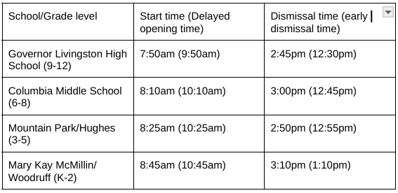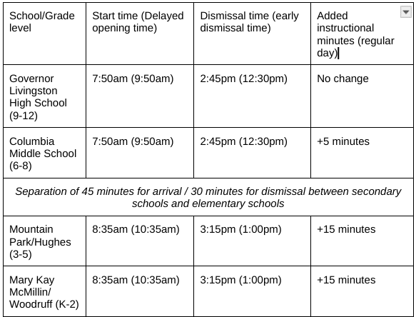 The length of the school day in Bernards is shortened by five minutes at their middle school and 12 minutes at their high school. The below BHPS provided scenarios avoid any cut to instructional minutes (other than delayed opening/early dismissal tweaks) and actually adds instructional minutes in some scenarios: