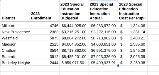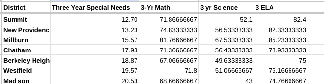 Millburn spends significantly less per pupil on Special Needs, has the fifth largest 3 year average percentage of Special Needs Students while ranking highest in every proficiency category out of the 7 Districts.