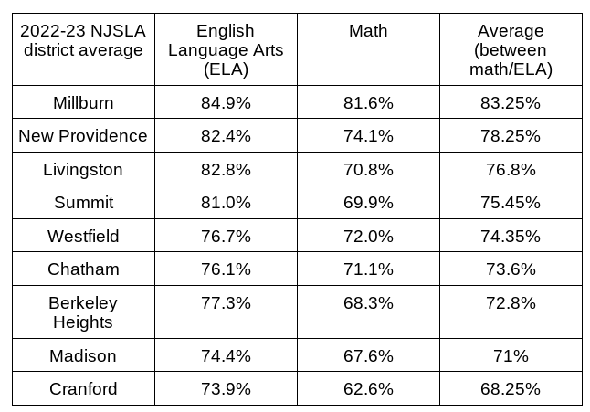 The below chart was shared during the most recent New Providence BOE meeting but re-organized from highest to lowest test scores in their nine district summary.