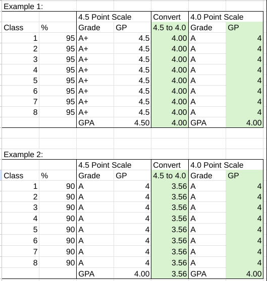 Essentially because we give 4.5 points for an A+ in the unweighted system it effectively diminishes the value of an A, B, C and D. So a student from a 4 point scale school who averages 90s would have a GPA of 4.0. A student from our school who averages 90s would get a GPA of 3.56 once the college converts our scale to a 4 point scale.