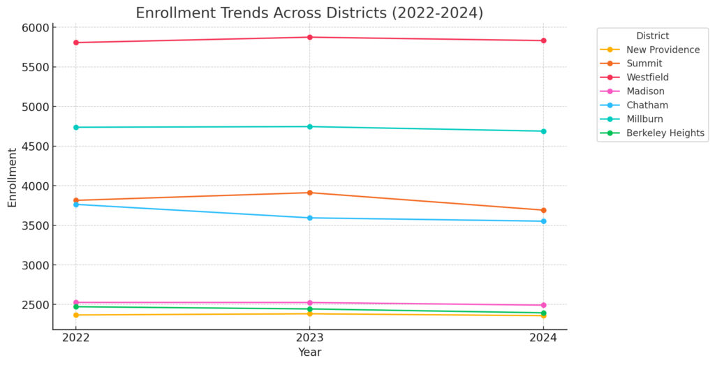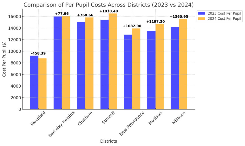 Although progress has been made in slowing per-pupil cost growth, Berkeley Heights remains the most expensive district of the seven, while New Providence continues to demonstrate strong cost efficiency alongside strong student proficiency rates on NJ DOE reports (as of 2023).