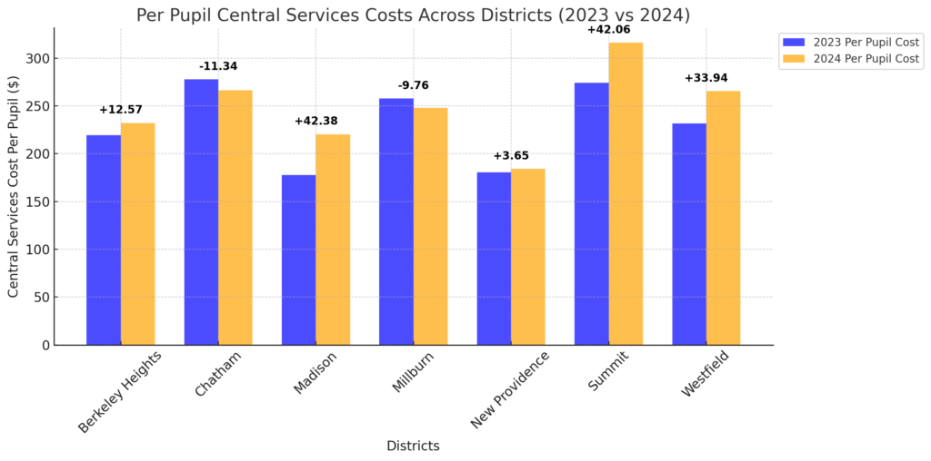 Summit, Westfield and Chatham experienced the largest per pupil cost in Central Services with New Providence having the lowest per pupil spend.