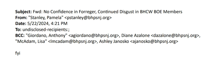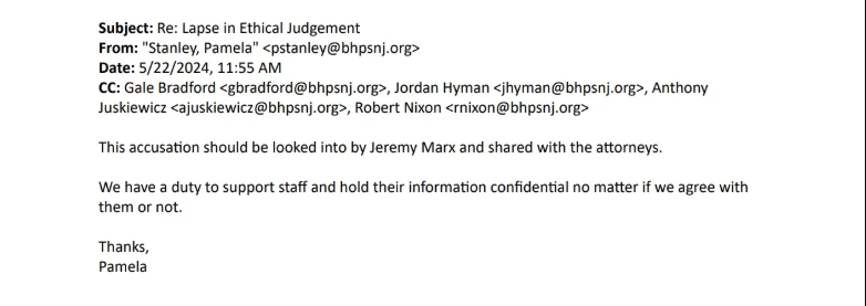 Ms. Stanley, who just forwarded the same email to BHPS employees, is now demanding an ethics investigation into confidentiality breaches—because someone noticed a single common phrase in the employee’s email matched an article on NJ21st and reported it to the BOE.