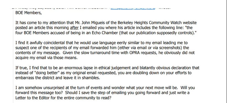 The next email in the chain is from a BHPS employee who implies that a Board member leaked his message to NJ21st. His evidence? A budget article used the phrase “echo chamber,” which he had included in his email. From this single similarity, he jumps to the conclusion that a leak occurred —despite the fact that NJ21st has been accused of this very behavior by various former BOE members and their allies long before his email was ever sent.