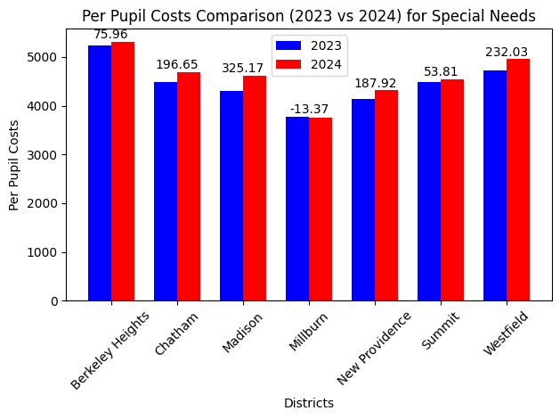- Chatham experienced the highest absolute and relative increase, with its per pupil cost rising by $183.83—roughly a 16.2% increase from its 2023 cost.