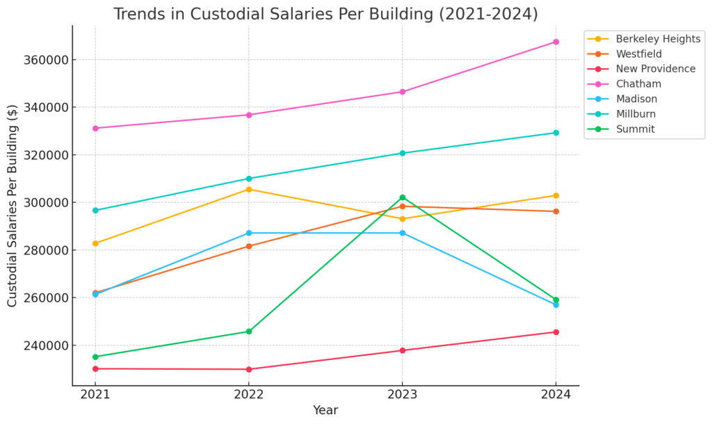 Chatham had a steady increase each year, rising from $331,216.83 in 2021 to $367,518.83 in 2024, marking the highest per-building salary costs among all districts, while Berkeley Heights saw a notable increase from $282,836.28 in 2021 to $305,520.79 in 2022, followed by a dip in 2023 and a recovery in 2024 to $302,933.26.