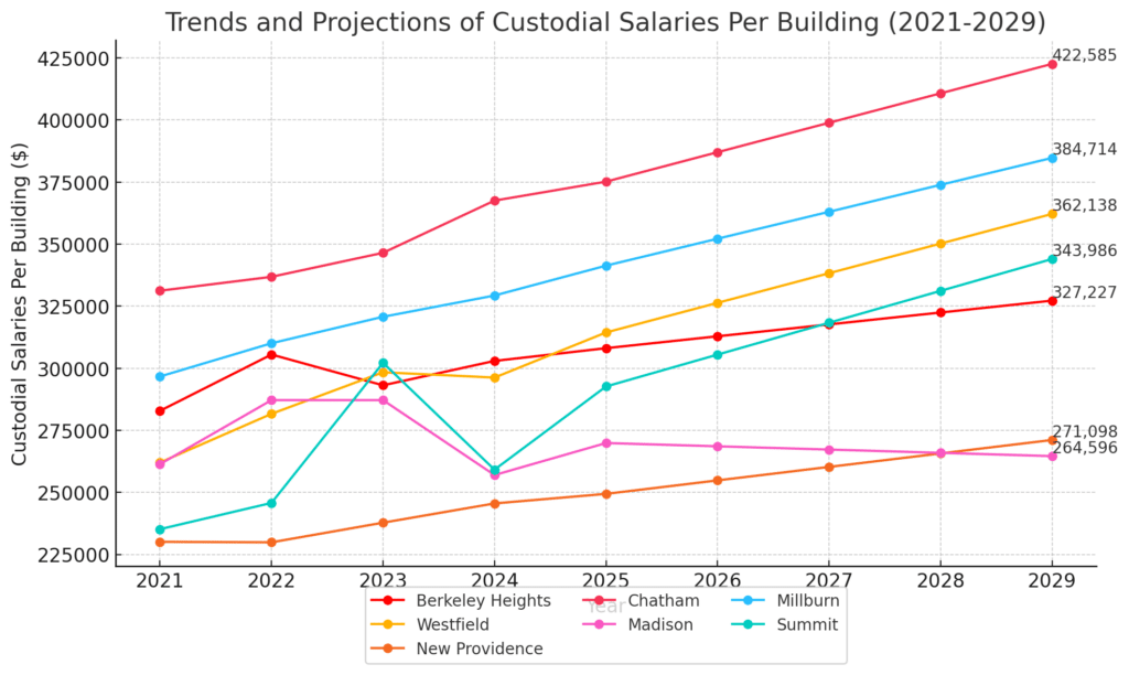 Using projections based purely on linear statistical modeling, which does not account for retirements or price fluctuations, Chatham is expected to continue increasing, reaching $422,584.94 per building by 2029 and maintaining its lead in custodial spending, while Millburn and Berkeley Heights are projected to see steady growth, reaching $384,714.00 and $327,226.68 per building, respectively, by 2029.