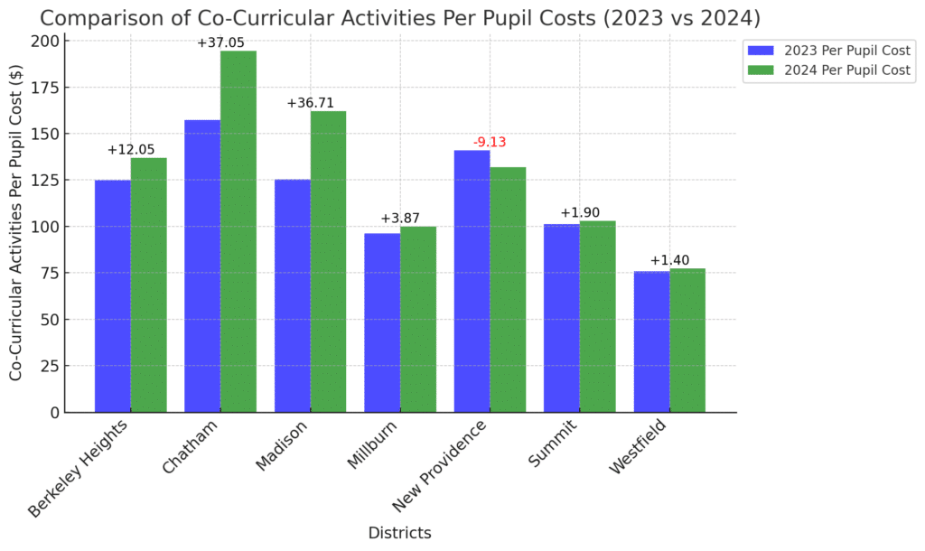 New Providence was the only district to reduce athletics spending per pupil, decreasing from $352.04 to $344.92, possibly due to budget cuts or cost-saving measures.