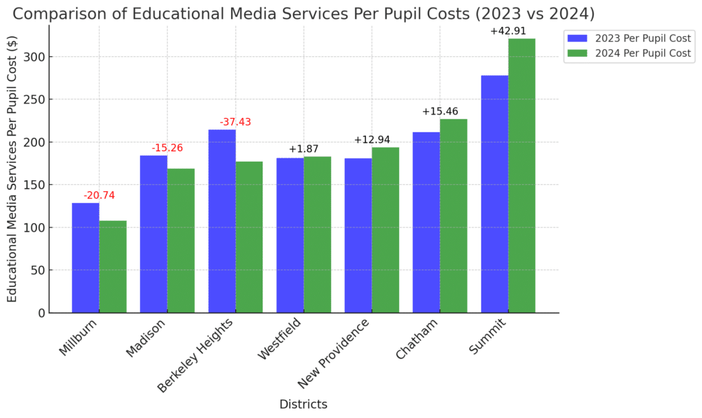 Athletics, Co-Curricular, Textbooks and Educational Media Services Per Pupil Cost Break Down for Berkeley Heights, Chatham, New Providence, Summit, Millburn, Madison, and Westfield