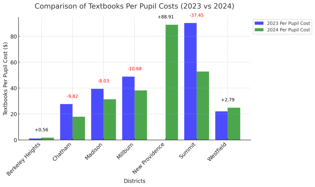 New Providence had the most significant increase in spending, jumping from $0.00 in 2023 to $88.91 in 2024, suggesting a major new investment in textbooks.