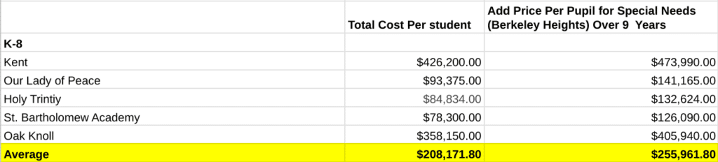 The total K-8 cost for BHPSNJ comes out to $265,260 per student, making it the third most expensive option if included in the private school table. This places BHPSNJ $10,000 above the average private school cost for K-8.