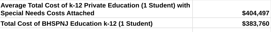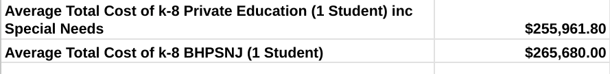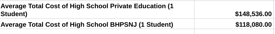 - Total K-12 cost for BHPSNJ: $383,760 per student