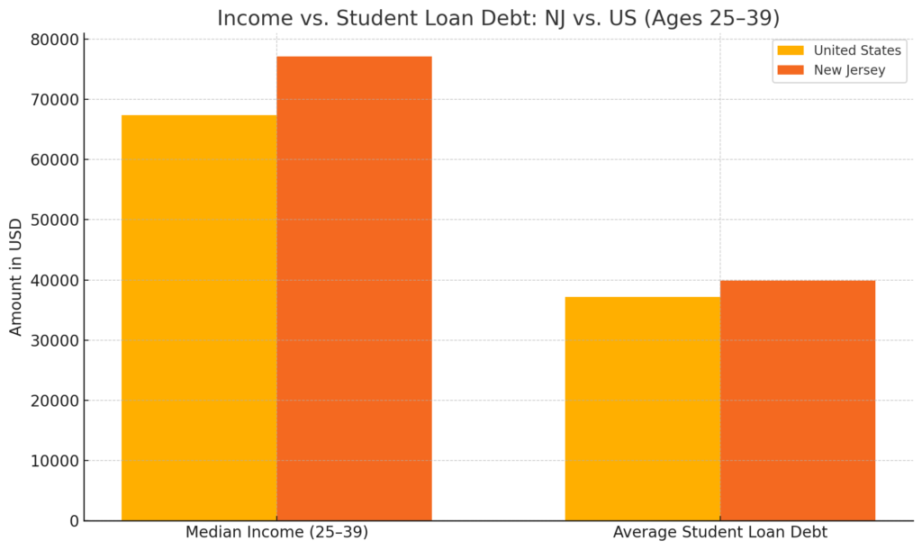 According to the U.S. Census Bureau, college graduates in New Jersey between the ages of 25 and 39 earn a median annual income of $77,166, compared to $67,362 nationally. That $9,800 difference, while notable, may not be enough to offset the state’s higher cost of living or the larger-than-average student loan balances many residents carry. As a result, borrowers in New Jersey may feel greater financial strain during repayment — even though they technically earn more than their peers nationwide.