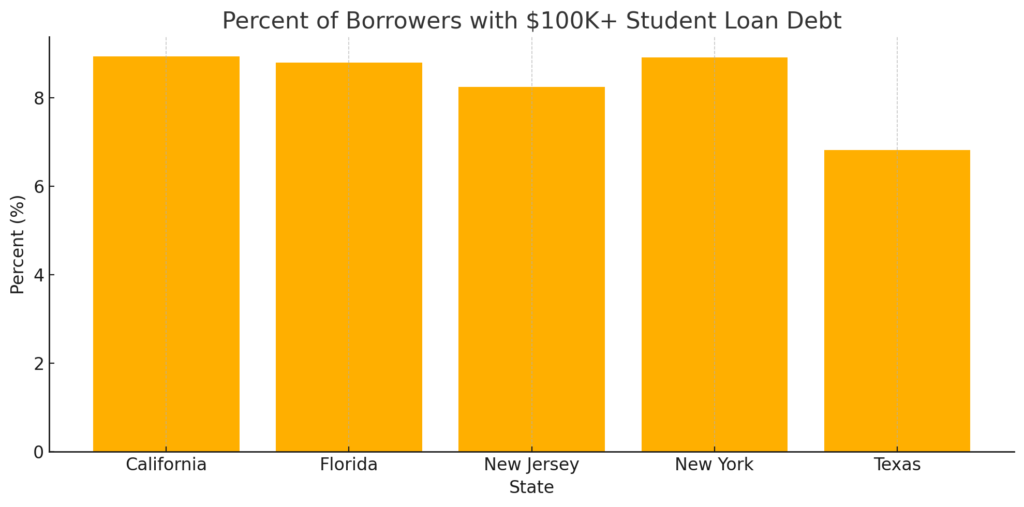 New Jersey falls just outside the top 15 and over 8% of New Jersey borrowers owe more than $100,000— matching or exceeding larger states like California, Florida, and New York-despite a smaller borrower base.