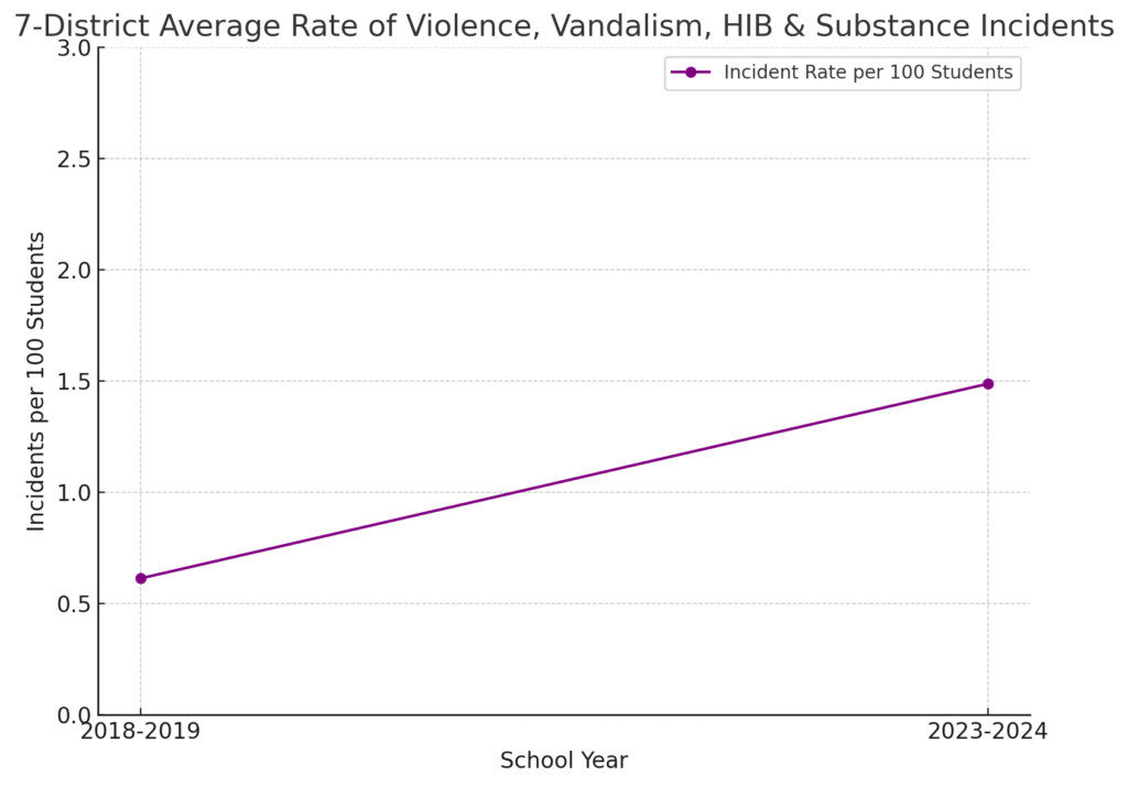 Summit recorded the highest rate of incidents in 2023–2024 at 2.74 per 100 students, nearly tripling its 2018–2019 rate (+1.93).