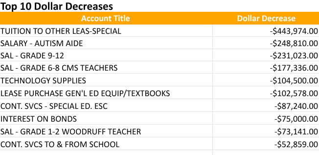 Top Ten Decreases from 2024-2025 Approved to 2025-2026 Proposed Budget (Dollar Amount)