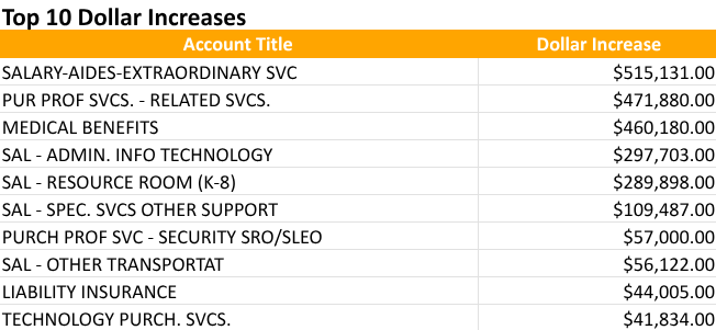 Top Ten increases from 2024-2025 Approved to 2025-2026 Proposed Budget (Dollar Amount)