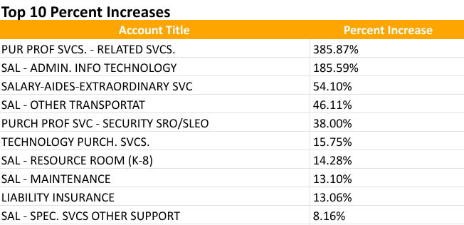 Top Ten increases from 2024-2025 Approved to 2025-2026 Proposed Budget ≥ $100,000 24–25 Approved Budget (Percentage)