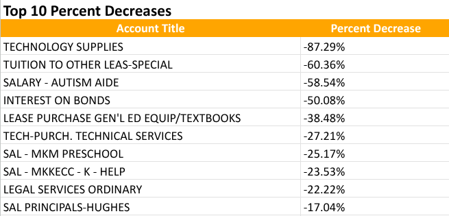 Top Ten Decreases from 2024-2025 Approved to 2025-2026 Proposed Budget ≥ $100,000 24–25 Approved Budget (Percentage)