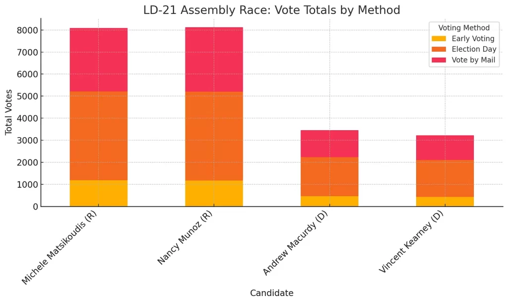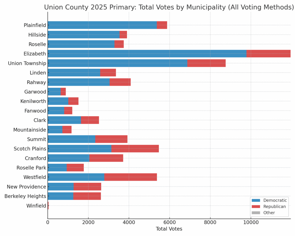 In some towns, Republicans made up more than 60% of the total ballots cast. That edge carried down the ballot, with Munoz and Matsikoudis receiving some of the highest raw vote totals in their respective races. Their support wasn’t just deep—it was geographically widespread. Every LD-21 municipality in Union County leaned their way, often by wide margins.