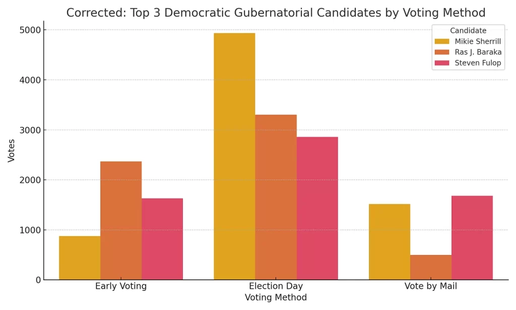 Vote-by-mail played a major role for Sherrill, Fulop, and Ciattarelli. Baraka leaned heavily on early voting and had the strongest performance in that category. For most candidates, Election Day saw the biggest turnout.