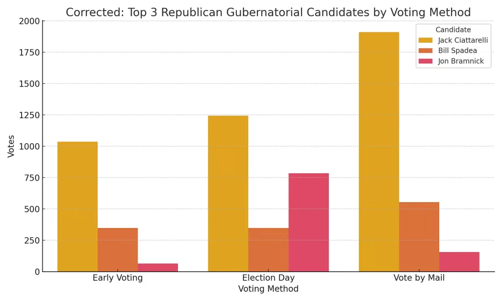 Jack Ciattarelli led the Republican side with 4,189 votes, finishing well ahead of the rest of the field. He led in every voting category and had especially strong support among vote-by-mail voters.