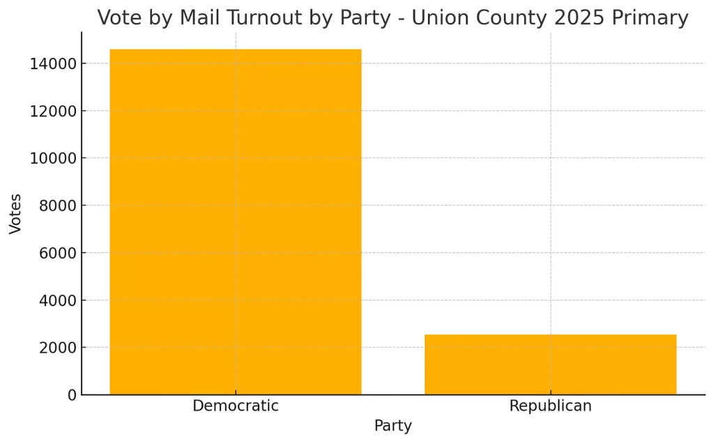 Democratic voters made much heavier use of mail-in ballots than Republicans – they made up 75% of all VBM ballots in Union County.