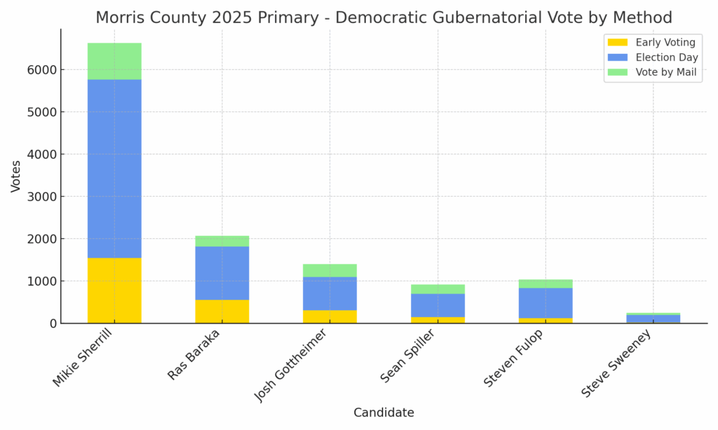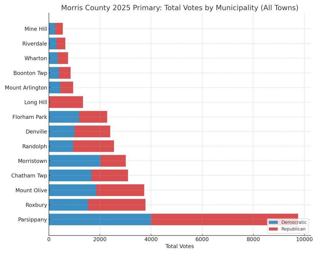 54,703 ballots were cast across Morris County during the 2025 primaries. Republican votes held the greater share in Morris County (30,755 R v. 23,948 D).