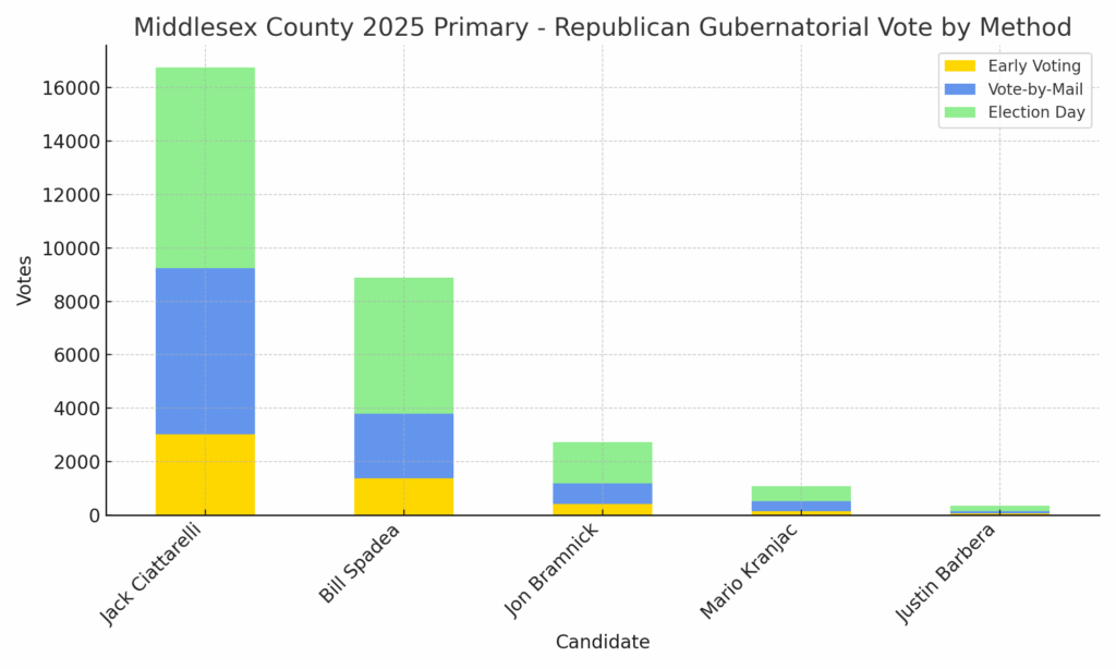 Ciaterelli dominated the Republican side and while Sherrill saw healthy competition from Baraka and Fulop – she won easily in a crowded field. Both candidates led across every voting method for their respective parties.