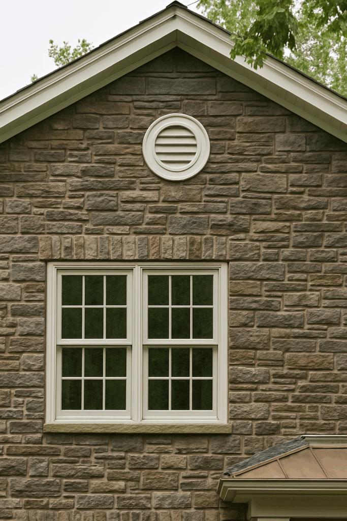 The circular vent at the top of the stone wall, and the mullioned windows, help give an authentic feel to the design.