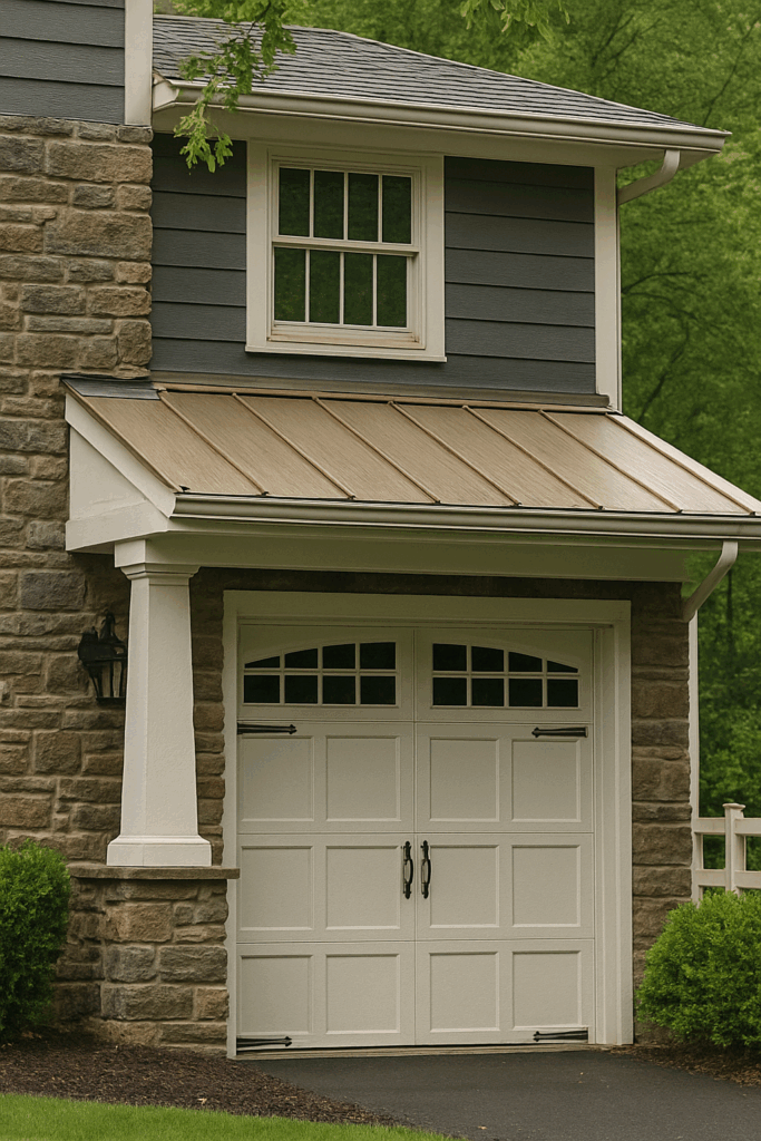 The color blends beautifully with the rest of the home’s exterior, which includes metal roofing over the entrance and garage.