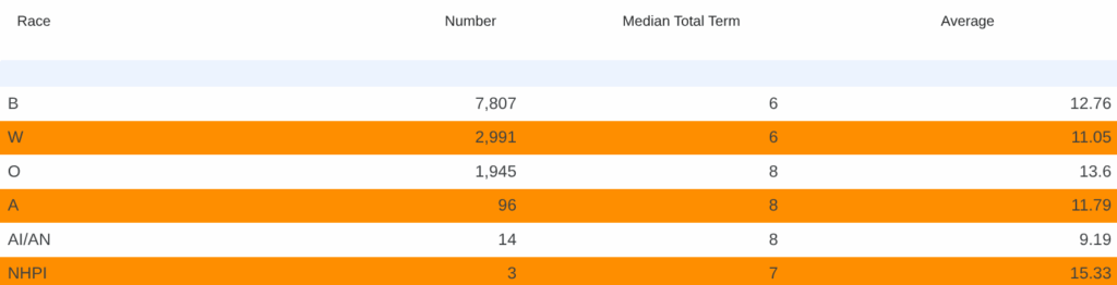 Black and White individuals both have a median sentence of 6 years. But when you look at averages, Black individuals are serving longer terms overall—more than 12 years on average. The “Other” and Pacific Islander groups also show long average sentences, though the sample sizes are small and more easily skewed by outliers.
