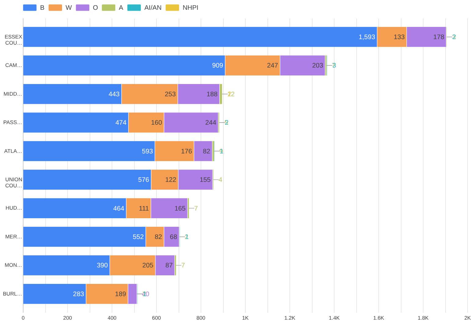 This chart shows which counties sent the most people to state prison. Essex, Camden, and Middlesex top the list. Together, they account for nearly a third of the entire prison population.