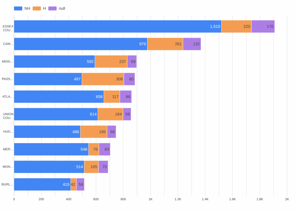 Most people in New Jersey state prisons are classified as non-Hispanic with Hispanic individuals as a stronger presence in Passaic, Camden, and Middlesex.