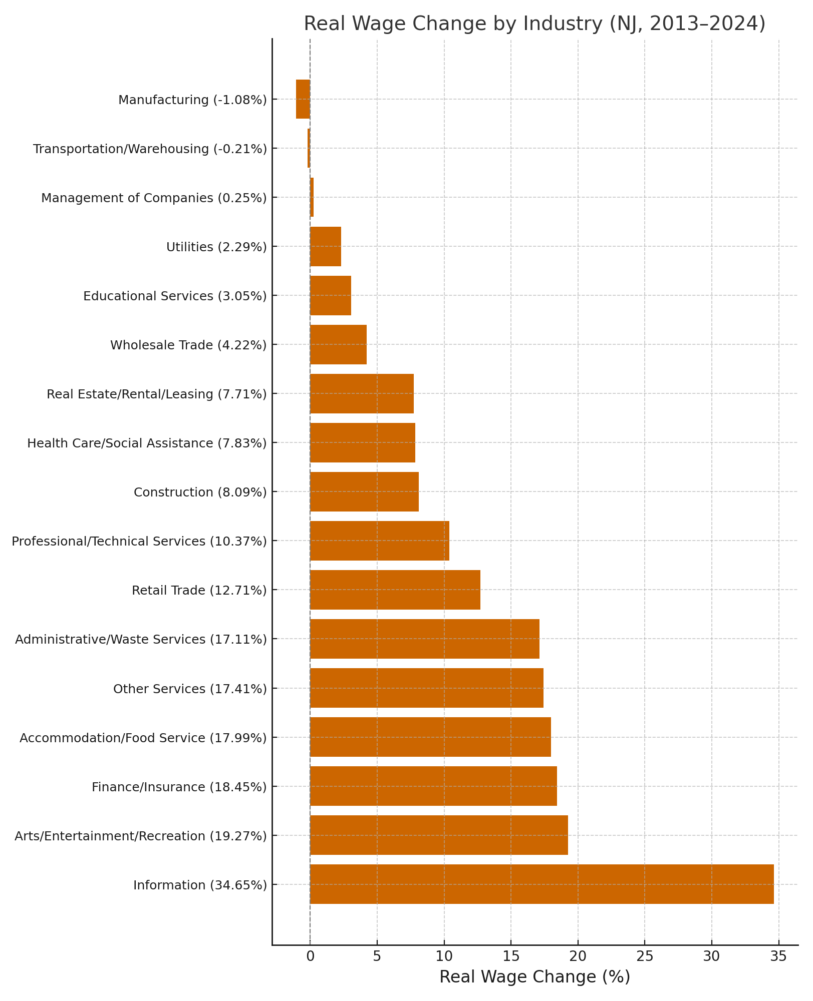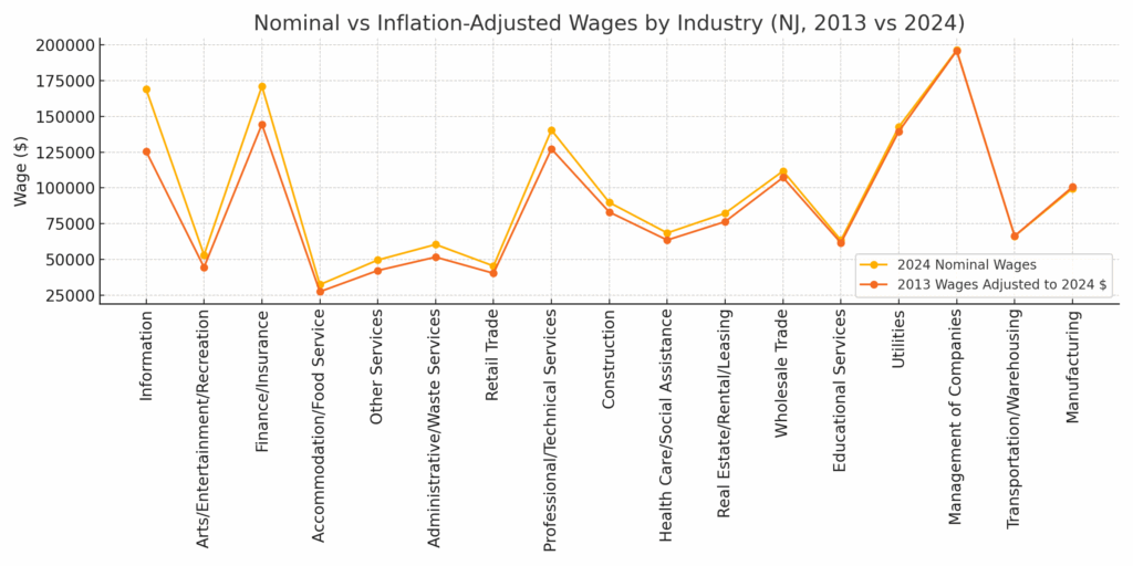 Over the past decade, wages in New Jersey have gone up—but in many cases, not enough to keep pace with the rising cost of living. NJ21st looked at state and federal labor data to see how different industries have fared since 2013, adjusting for inflation using local cost-of-living data from the New York–Newark metro area.