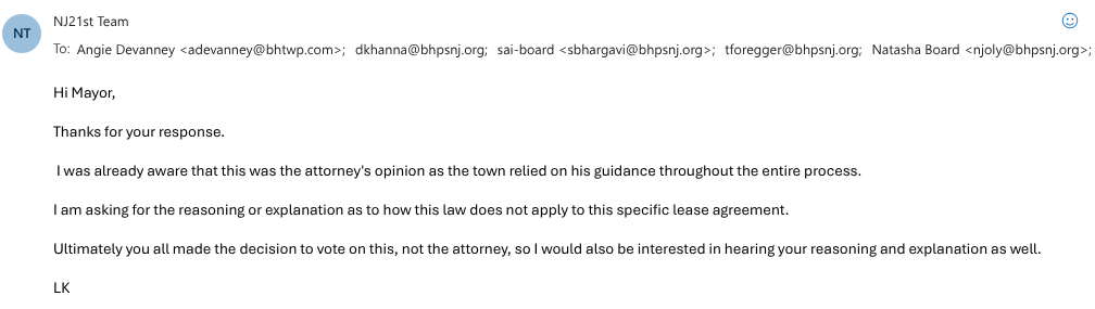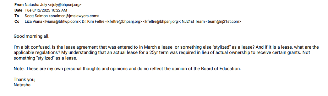Also on Aug. 12, Board of Education member Natasha Joly weighed in, saying she was “a bit confused” as to whether the March agreement was an actual lease or something merely “stylized” as one. She recalled that the Township had previously argued a 25-year lease — an actual lease, not a rebranded arrangement — was needed in lieu of ownership to qualify for certain grants.