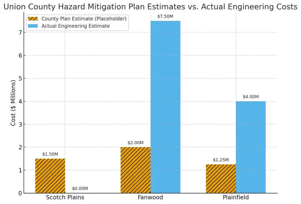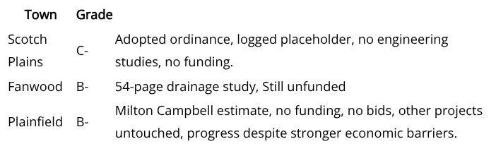 In Scotch Plains, the township stuck to compliance tasks and logged a placeholder. Fanwood went further, commissioning a 54-page drainage study. But its $7.5 million price tag dwarfed the $2 million listed in the county plan — and it remains unfunded.