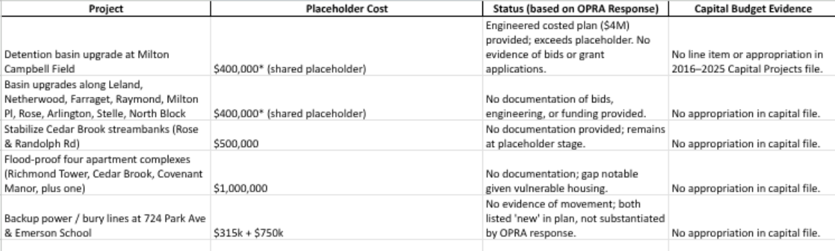 While Milton Campbell is clearly addressed, the rest of its Hazard Mitigation Plan remains untouched. No evidence was provided of progress on Cedar Brook, flood-proofing apartments, or backup power for critical facilities.